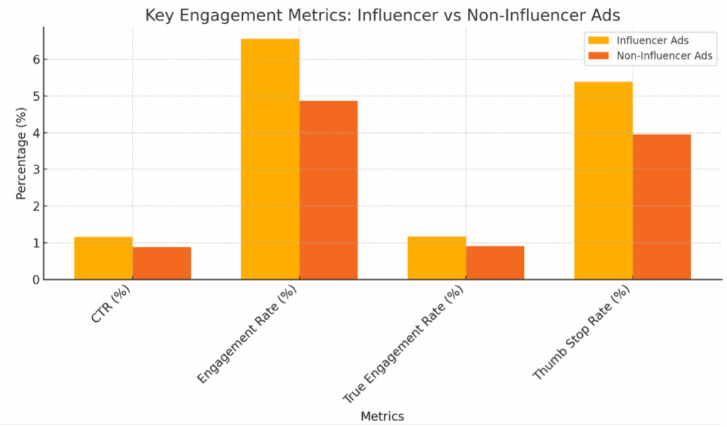 Influencer-led ads significantly outperformed non-influencer ads across key engagement metrics: