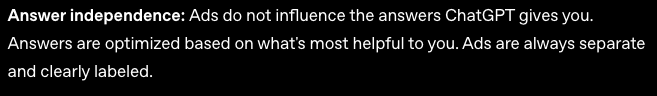 1: OpenAI have been very clear in the announcement that ads will not interfere or influence the results: