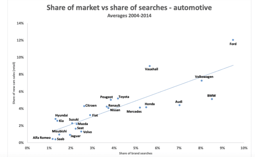 The importance of SoS mainly lies within its two-way relationship with share of market. Share of search not only correlates with market share but is also a leading indicator for it. This was demonstrated by Les Binet when reviewing historical data for search and purchase before in three different markets (below demonstrates the Automotive market). You can see the full data here: https://ipa.co.uk/effworks/effworksglobal-2020/share-of-search-as-a-predictive-measure/