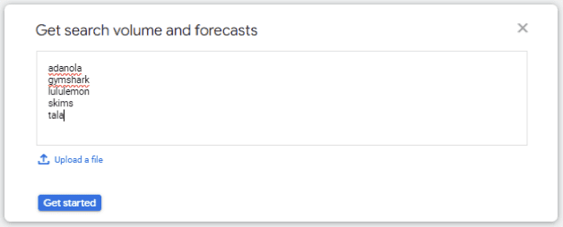 Step 2) Open keyword planner & choose get search volume and forecasts. Type in your competitors names.