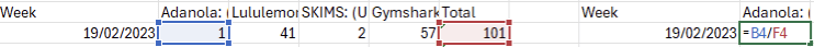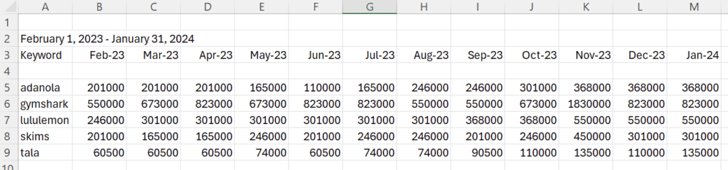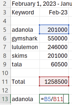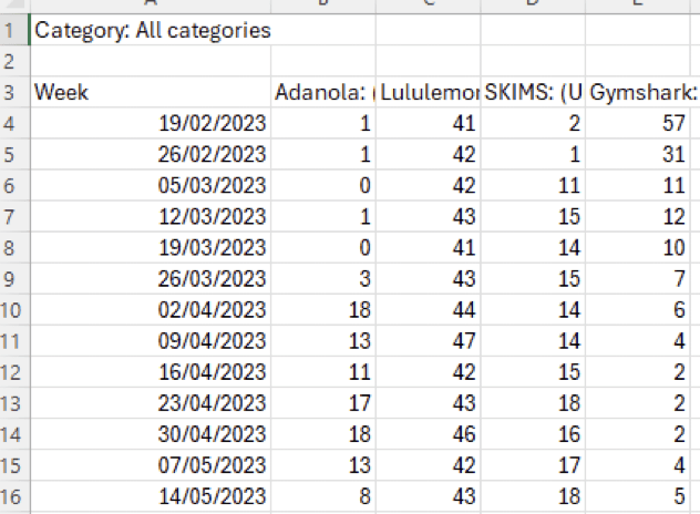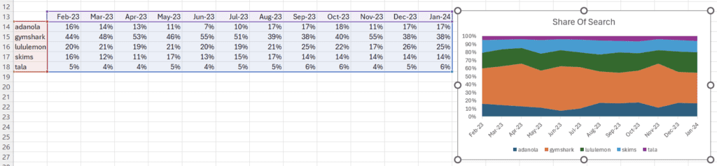 Step 7) Complete step 6 for every brand you are comparing & the drag this formula down for the time periods you are using.