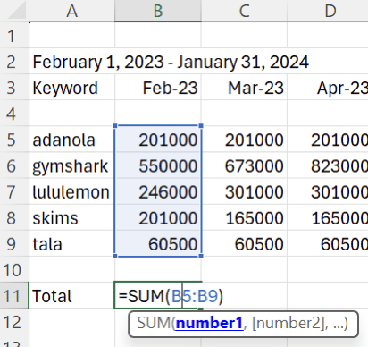 Step 5) Then we need to add up the total search interest for each time period, using the SUM formula.