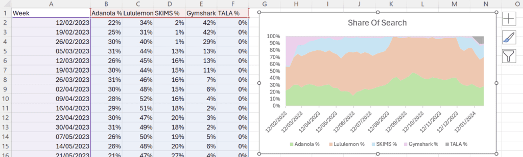 Step 8) Now you have calculated share of search for each brand for each time period, you can select all data and then create a number of visualisations, such as an area chart or pie chart.